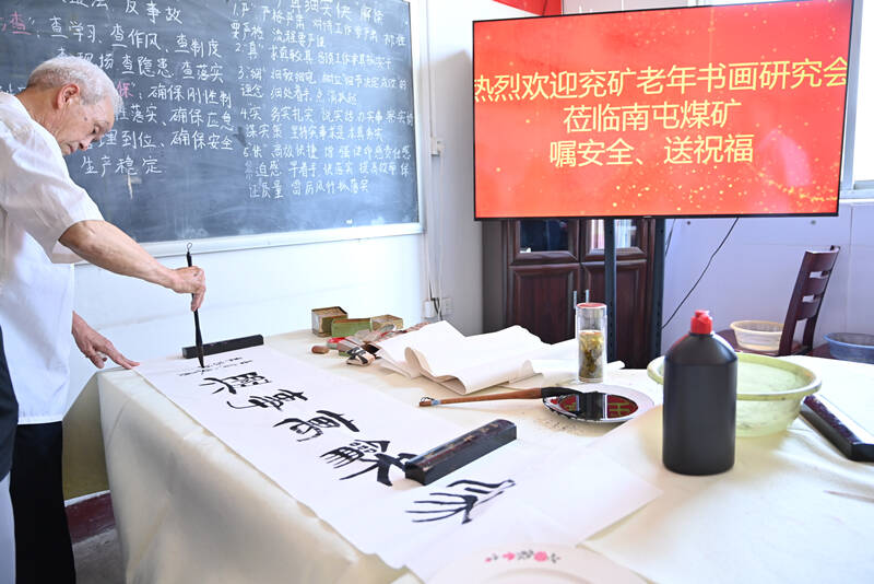 随后,兖矿老年书画研究会成员分两组来到该矿综采一区、综掘一区,现场挥毫泼墨为职工们书写作品、绘制画作。