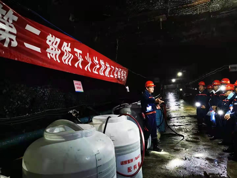 济三矿专业技术人员结合矿井实际,向参训学员讲解了防灭火钻孔施工工艺、水玻璃凝胶配比与压注工艺。在井下5317工作面设置的实操现场,通防工区防灭火技术工人进行现场演示教学,分享防灭火钻孔施工钻具、钻杆选型、钻孔施工工艺,着重讲解了钻孔施工注意事项、钻机简单故障处理、注胶泵使用方法及简单故障处理、防灭火钻孔注胶管路连接等内容。