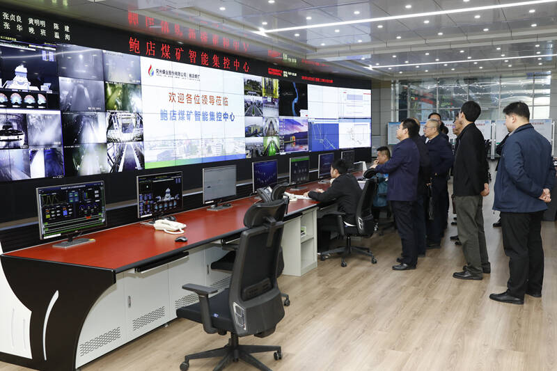调研组在观看鲍店矿形象专题片《光和热的故乡》后,前往该矿智能集控中心进行参观交流,详细了解该矿智能化建设情况。分为井下、地面两组前往井下胶轮车副巷智能掘进工作面、“双创”基地及暖心志愿服务中心实地调研矿井智能化建设和党建工作。井下组成员升井后,在智能集控中心观摩了7304智能化综放工作面一键启停功能演示,并围绕智能采煤技术、设备选型展开讨论。