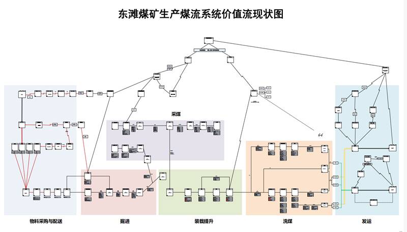 打造煤流联动高效化,持续改善提升运营管控能力。通过对东滩煤矿煤流生产体系的价值流程分析,梳理矿井煤流系统、物流系统、调度信息系统价值链条,详细分解查找矿井从掘进-采煤-运输-提升-洗选-发运整个生产系统,以及物料从计划-供应-领取-发放物料管控系统,从调度生产信息流及销售信息流等方面的深度梳理和查找,绘制形成煤流联动价值流程图,找准制约矿井运营的异常点和瓶颈点,通过对瓶颈点关键指标分析,针对性制定持续改善计划,提高矿井煤流提升准时率、物料配送准时率、产量达成率,不断提升矿井精益管理水平和运营能力。
