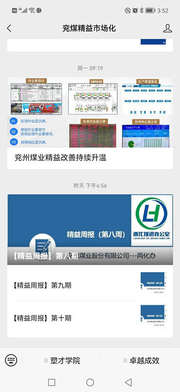 专刊专栏,营造精益改善舆论氛围。创立“兖煤精益市场化”微信公众号,分享“两化”融合建设培训课件、工作动态及改善成效。东滩煤矿开辟【两化融合】专题专栏,及时发布项目建设进度及推进效果;制作精益管理知识每周一分钟视频,在基层区队会议室、矿广播电视、井口大屏等多平台滚动播放,确保精益知识宣贯进基层。项目组设立“精益改善园地”,将精益活动及改善对比效果及时公布上墙,塑造浓厚的精益改善氛围。8月份以来,在煤炭工业网、鲁煤之光、山东能源等媒体平台宣传“两化”融合稿件10余篇,兖州煤业、东滩网站宣传稿件20余篇,形成周报11期、月报3期、通报3期,为公司两化融合建设目标的持续达成奠定基础。(赵奎 李欣)