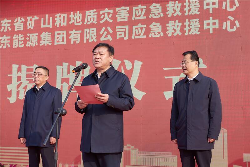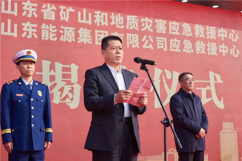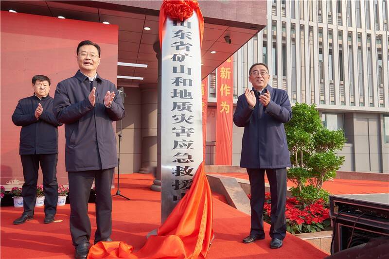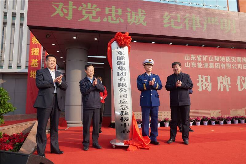 揭牌仪式上,汲斌昌、于永生为“山东省矿山和地质灾害应急救援中心”揭牌,辛广龙、李伟、李建春、张胜明为“山东能源集团应急救援中心”揭牌。