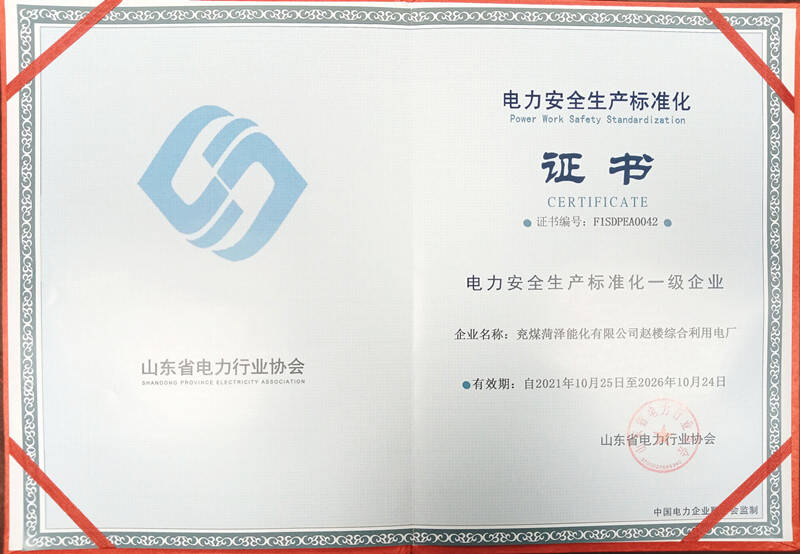 2021年12月23日,华聚能源赵楼电厂获得山东省电力企业协会颁发的“电力安全生产标准化一级企业”奖牌和证书,这是继2016年该厂荣获此荣誉后再以93.05高分获此殊荣,也标志着该厂安全生产标准化管理工作跃上新台阶。