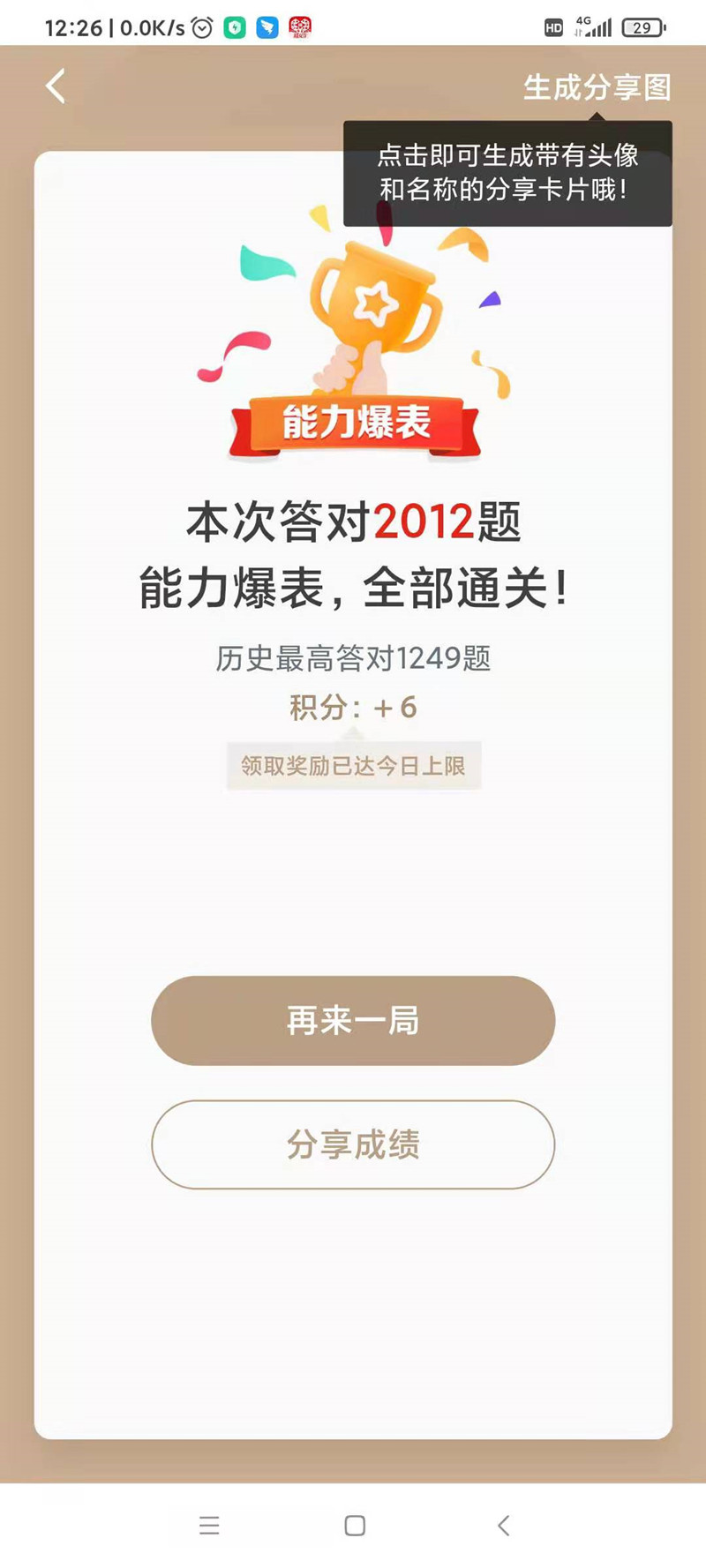 “本次答对2012题,能力爆表、全部通关。”