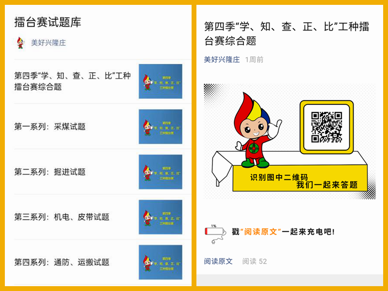 “原来想学习得到处找书本、查资料,现在好了,打开咱们矿上的微信公众号‘学、知、查、正、比’擂台赛试题库,想要学的知识应有尽有!”