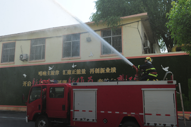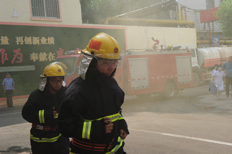 演练模拟制衣厂四楼缝纫区因设备电线短路引燃周围可燃物,并迅速向四周蔓延,对职工生命和财产安全构成威胁。