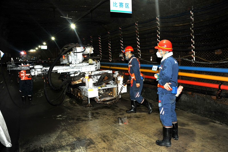 比赛现场设在济三矿123上01(南)工作面辅顺巷道,现场气氛紧张热烈,秩序井然,各参赛选手按照技能比赛规则和规程要求,严格遵守操作规程和比赛规则,精心操作,娴熟配合,认真细致完成每一道工序,充分发挥自身优势和特长,展示出过硬的业务技术。裁判组对每一组参赛队伍对施工前的准备工作、钻孔施工过程、规范操作情况、施工记录、文明施工、施工效率等方面进行现场打分,并现场点评存在的优缺点。