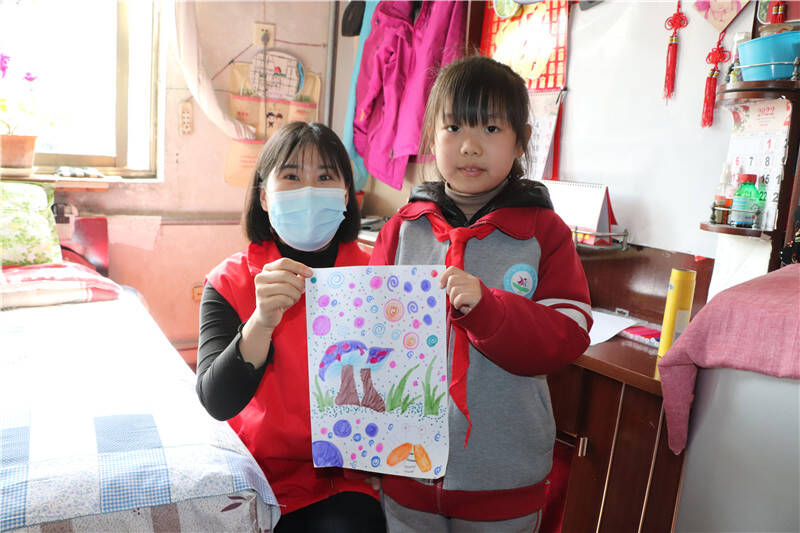 在机电工区职工王训强家中,志愿者们为王训强女儿送去孩子期待已久的“冰墩墩”,“这是我最喜欢的了,感谢哥哥姐姐给我准备的礼物”,抱着憨态可掬的北京冬奥会吉祥物,小家伙高兴极了。得知孩子喜欢画画,志愿者王树燕自告奋勇,与孩子共同作画,描绘春天的美好景色。