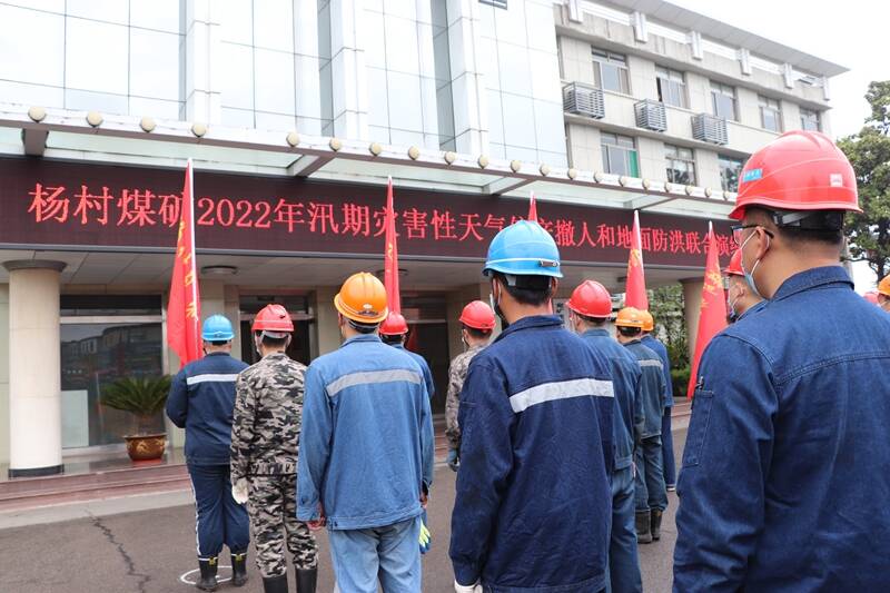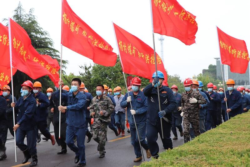 “井下所有人员请注意,泗河洪水已超过警戒水位,立即停产撤人。”5月13日上午9:00,一阵急促警报声在雨中响起。杨村煤矿生产调度指挥中心值班员立即通过井下语音广播系统下达停产撤人的命令,一场汛期灾害性天气停产撤人和地面防洪联合演练全面打响。濛濛细雨,为联合演练增加了“实战”色彩。
