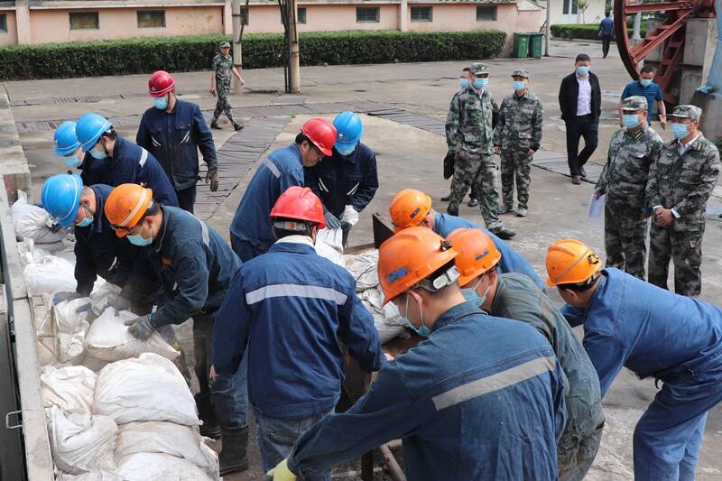该矿防洪抢险应急总指挥接到险情报告后,启动《灾害性天气专项应急预案》和《泗河暴雨洪水防御专项应急预案》。矿各抢险队伍听到警报后迅速到达集合地点,在接到抢险命令后,奔赴主副井口、35kv变电所、南北风井、泗河河堤等重要防汛抗洪地点,火速投入到“实战”演练中。矿山救护组、医疗救护组精神饱满、到位待命。