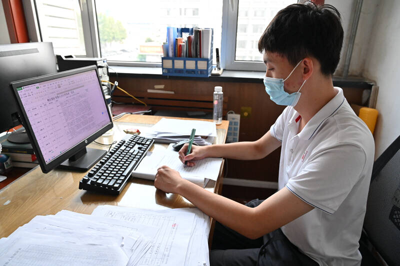 隋东澔从前一天晚上九点到第二天上午十二点,一直在协助核查流调信息,几乎一夜未眠,才在规定时间及时核查完工区内90余名职工的信息。对着电脑录入行程数据,时间久了他也会头晕眼花,但他依旧坚持在岗位上,展现出了新分大学生勇于担当的精神。他说“我作为志愿者感到无比光荣。很高兴能传递爱心,奉献鲍店,希望通过我们的努力能够早日击败疫情”。