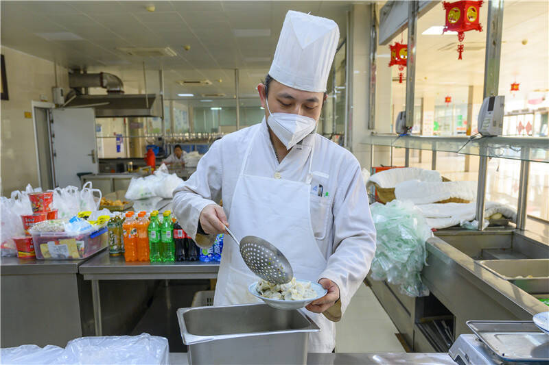 上午11:00,记者来到井口餐厅。班长雷兴洪向记者介绍说:“节日期间,我们餐厅的就餐人数激增,我们也制定了保障措施,做好后勤服务工作。”在售卖窗口,各种口味热气腾腾的水饺刚刚摆上,厨房里,厨师们还在紧张地忙碌着。“今天大年初一,我们得给坚守岗位的职工师傅们做点好吃的。”正在炒菜的师傅笑着说。说话间,一锅色香味俱全的杏鲍菇即将出锅。