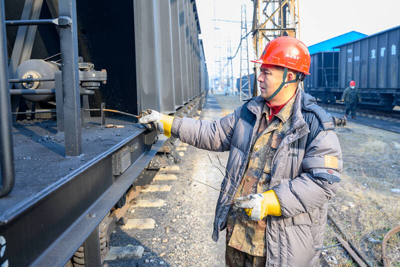 大年初一清晨,一列老K车驶入矿装车站。装车站班长张景良带领职工,开始新一年的工作。在寒冷的天气下,他们穿着厚厚的棉服,对每一个车厢进行放气和检查,做好装车的准备。只见前边的职工操作过后,张景良再逐个检查一遍。“检查程序虽然繁琐,但安全工作,容不得一丝大意。”张景良说道。