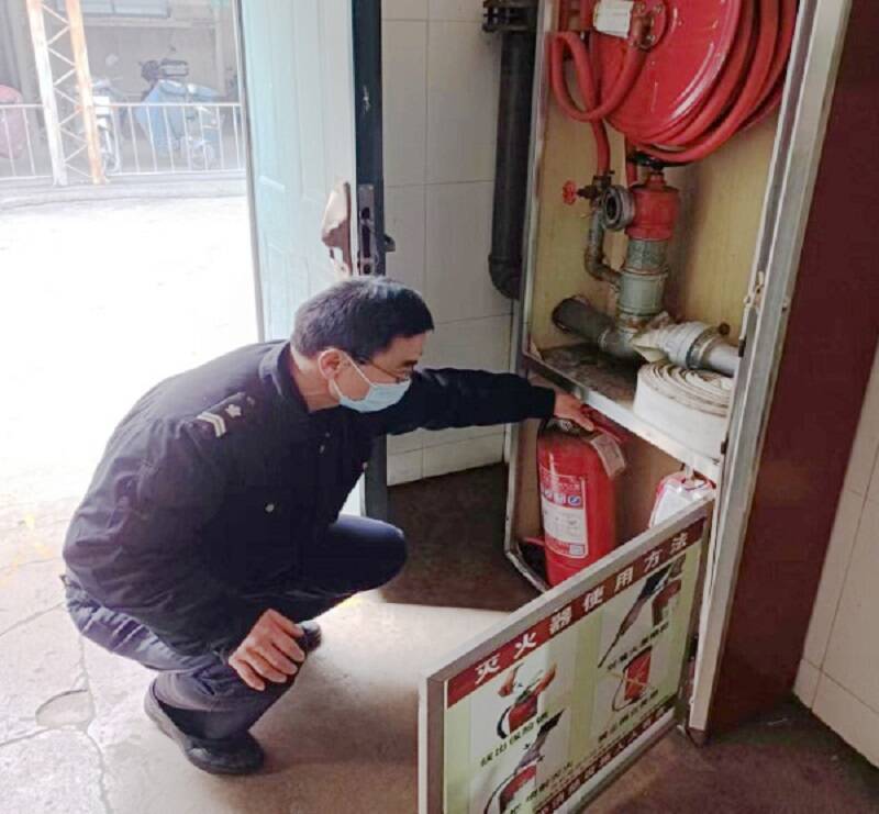 “这瓶干粉灭火器距保质期还有两周,及时做好更换。”