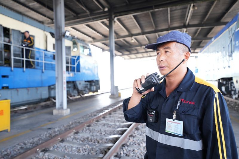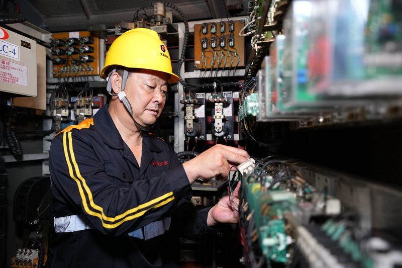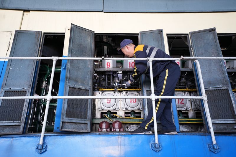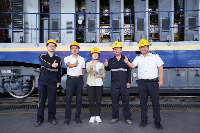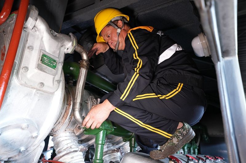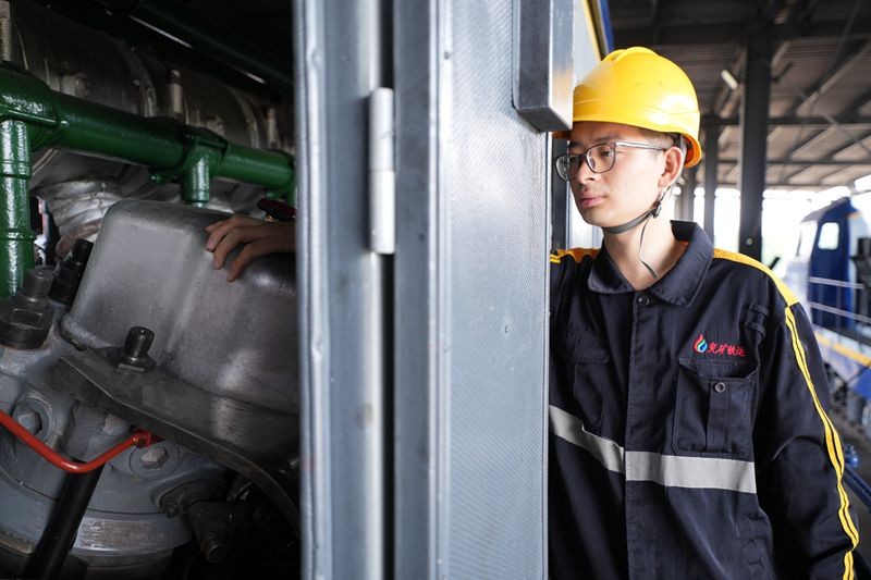 董金库是一名2021年新分大学生,师从吴忠新两年多了。在机车动力室旁,他不停地用手试探室内气缸端盖的温度,时刻准备着师傅因高温作业需要替换时冲上前。很多时候,故障检修需要攀爬到高处,小董忠实而细心地边照顾师父边认真学活儿:“老师说,干这一行,徒弟通常要6年才能独当一面,我要争取早一些出师!”小董稚气的脸庞透着坚毅向上的神情。