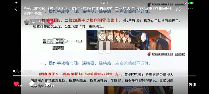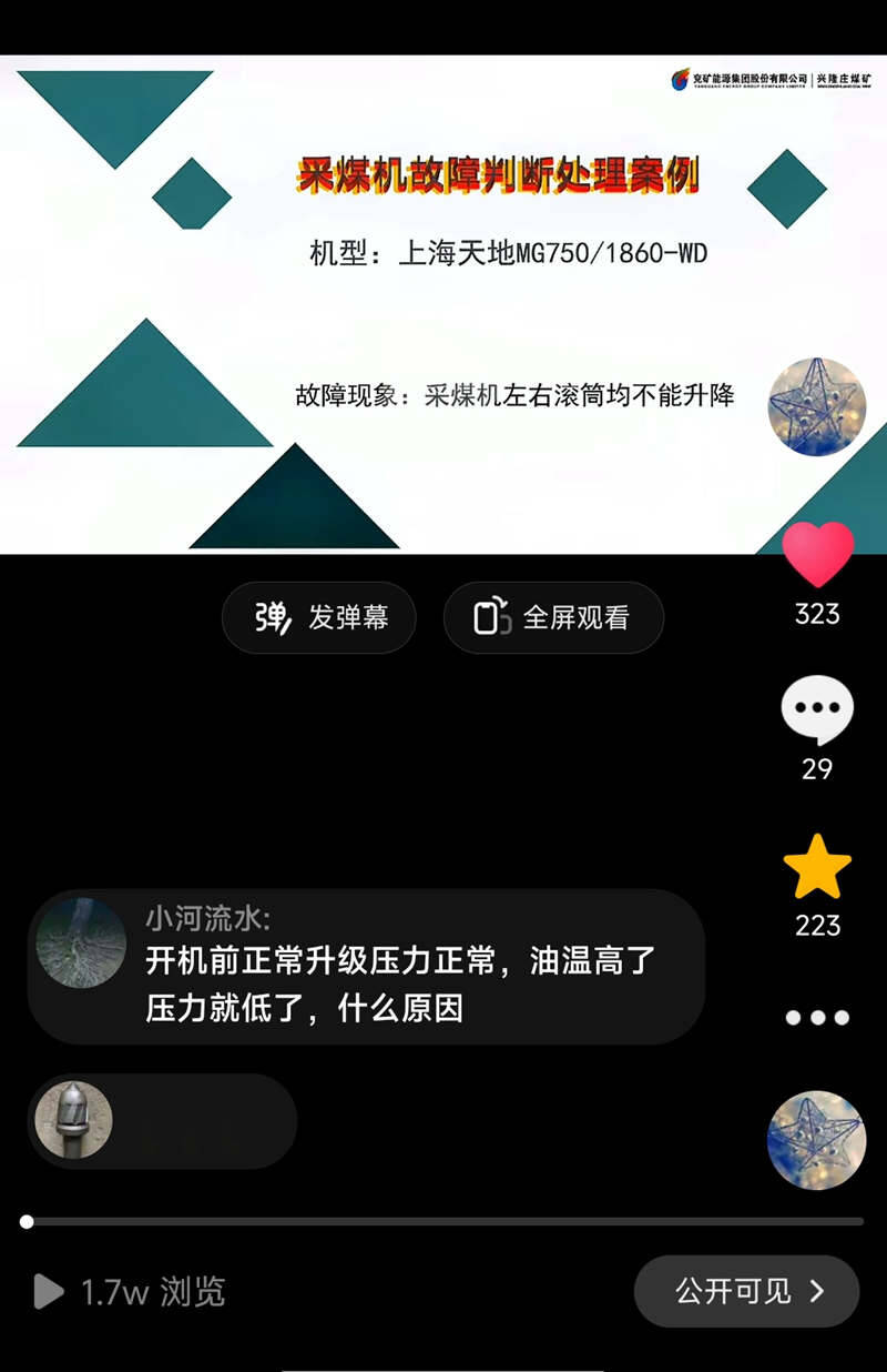 他们上传王小波劳模(技能大师)创新工作室制作的《采煤机故障判断处理案例-故障现象:采煤机左右滚筒均不能升降》短视频,搭建技术交流课堂。教学短视频一经发布,浏览量达到1.6万人次,点赞300余个,吸引山西、内蒙、贵州多地煤矿网友的关注互动。