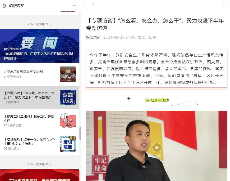 该矿先后开设访谈节目《“怎么看、怎么办、怎么干”聚力攻坚下半年专题访谈》《服务型科室访谈》等访谈栏目,在该矿微信公众号刊发后,引起了强烈反响,受到广大干部职工的热捧。“通过‘足不出户’看视频的方式就能参考别的单位的亮点做法,听到职工声音,对我们切实解决职工困难,开展后续工作提供了极大的便利。”生产技术科科长孟浩说道。