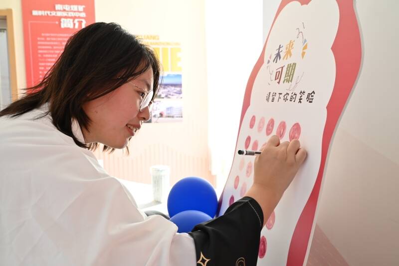 “花好月圆,情满中秋,星辰与山丘。欢迎你们来过中秋!”在南屯煤矿群团服务中心门口,该矿青年志愿者们早已守候在此,与每一位青年职工热情打招呼,并邀请他们在签到处画上属于自己的“笑脸”签名。