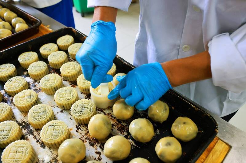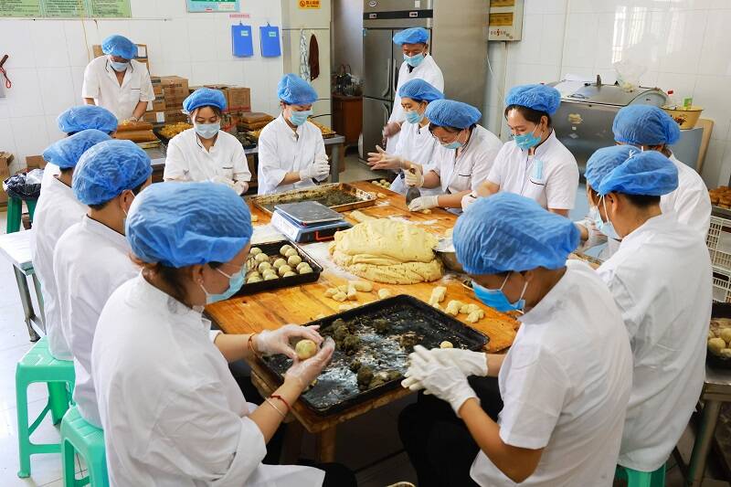 走进月饼制作操作间,在一张张的料理台前,面点师傅们正在有条不紊地紧张忙碌着。他们按照工序筛面粉、和面、醒面、处理饼馅、擀皮、包馅、收口、压模、烤制等繁琐的流程,制作出“五香牛肉、蛋黄沙、五仁、山楂、凤梨、豆沙”等六种口味,满足不同口味的职工需求。每一个加工过程都严格把关,力求每一道工序精益求精。