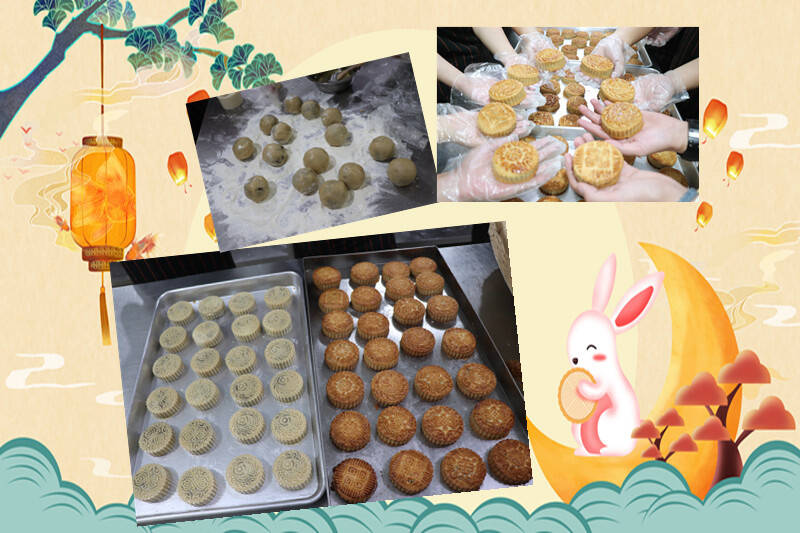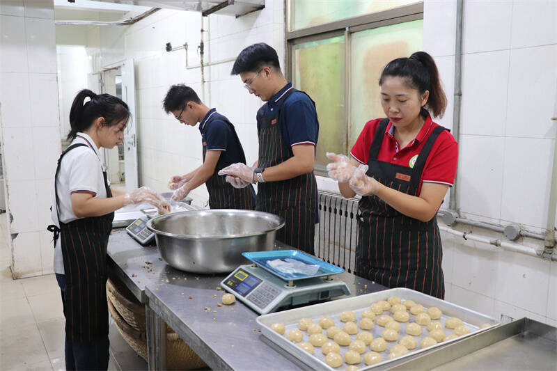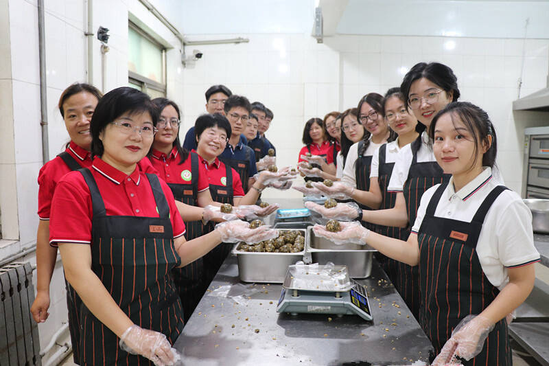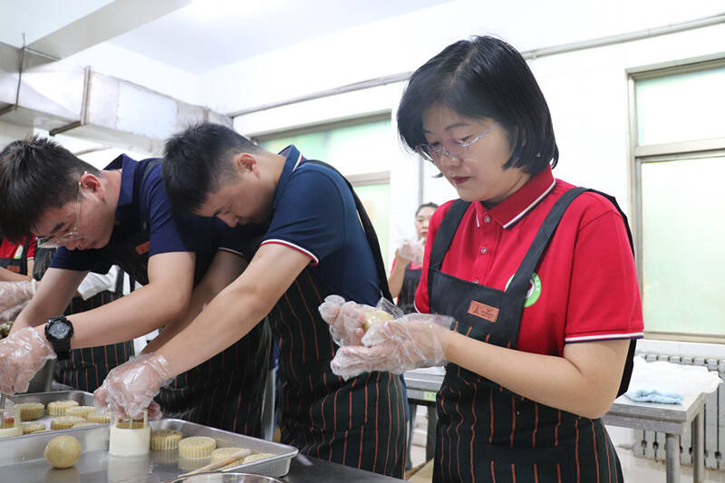 制作现场,大家认真完成饼皮制作、馅料调制、月饼脱模、烤焙等工序,你揉面,我捏皮,你压模,我装盒,一起唠家常、谈中秋习俗、聊工作心得,将温情揉进了面团,将祝福融进了甜蜜的馅料,欢声笑语、其乐融融。