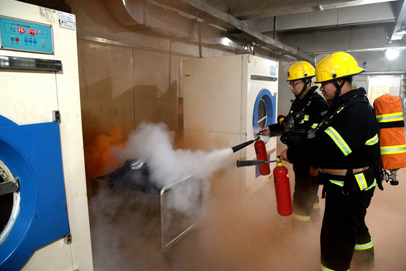 演练模拟场景为,副井口联合建筑工作人员发现洗衣机房烘干机加热管因温度过高,引燃烘干中的工作服,发生“火灾”事故。“着火了,着火了……”洗衣机房工作人员发现烟雾后在楼内大声呼喊,立即切断洗衣机房电源,拨打“119”报警电话,消防监控室自动报警系统接收到火情后,立即启动“10.30.60”应急处置机制。
