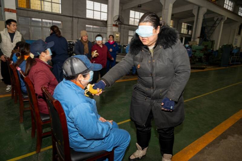 “准备攻关大挑战”小游戏环节,工友们两人一组,一名工友蒙上眼睛,原地旋转三周后,拿着剥好的香蕉送到坐在椅子上的工友嘴里,用时最短的一组获胜。参与游戏的工友一会儿跑偏了方向,一会儿拿着香蕉找不到队友的嘴,一会儿把香蕉抹的队友满脸都是……一个个滑稽的场景,让现场充满了欢声笑语。