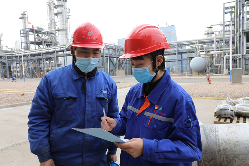 晚上八点,天已经黑透了,荣信化工合成车间女技术员李佳还在现场忙碌。从3月21日一期系统停车检修以来,她和车间技术管理人员几乎每天都要忙到很晚才能回家。