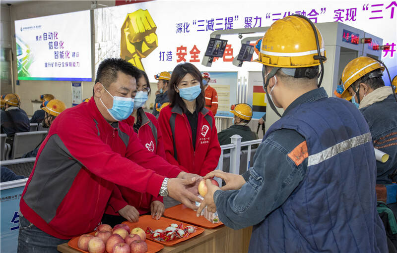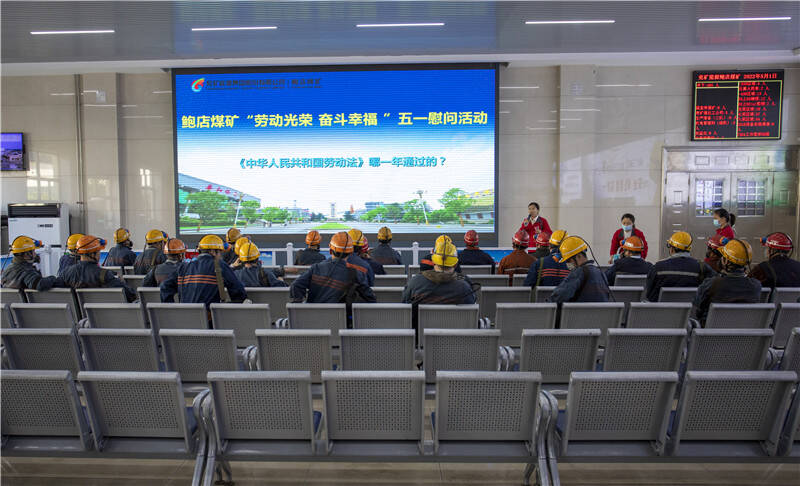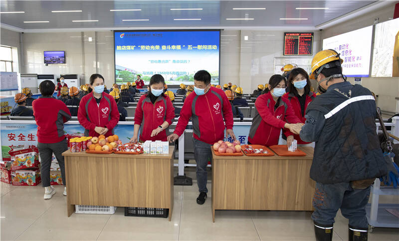 5月1日中午,鲍店矿工会在井口候罐大厅组织开展“劳动光荣 奋斗幸福”“五一”慰问活动。