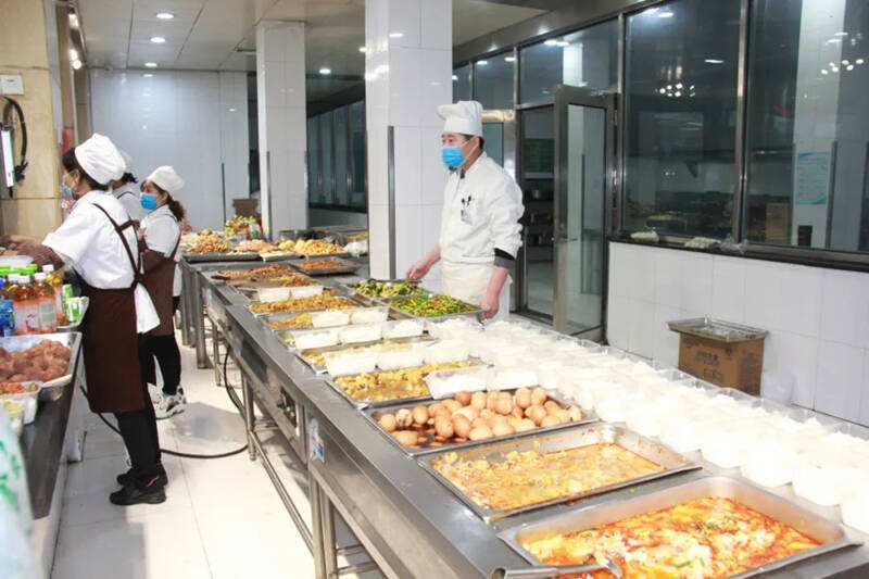 凌晨5点,职工食堂灯火通明,几十名工作人员早已在岗位上开始了一天的忙碌,消杀、备菜、蒸煮……一切井井有条、井然有序。