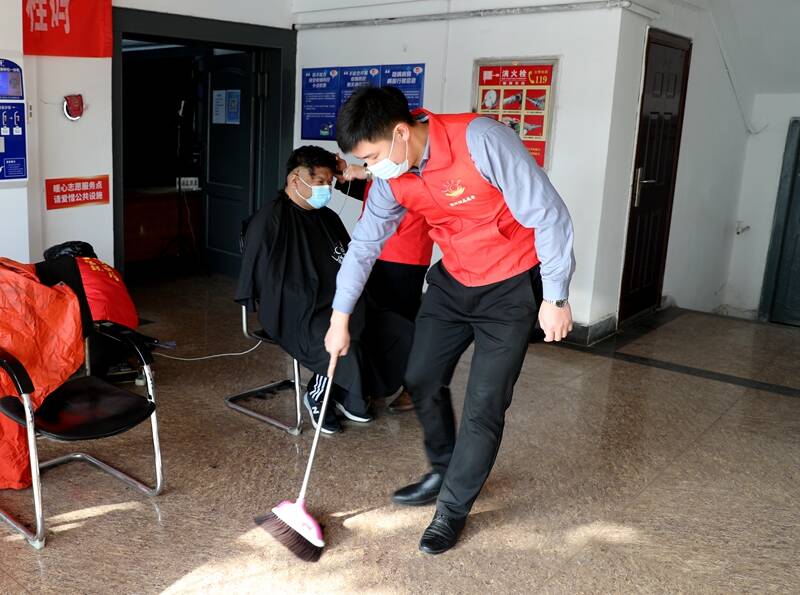 一副推子、一把剪刀、一把椅子、一条围布,简易的理发室很快准备完毕。理发现场,暖阳阳志愿者现场指挥,认真做好卫生清理和现场消毒,职工师傅严格按照疫情防控要求,全程佩戴口罩,自觉排队等候。