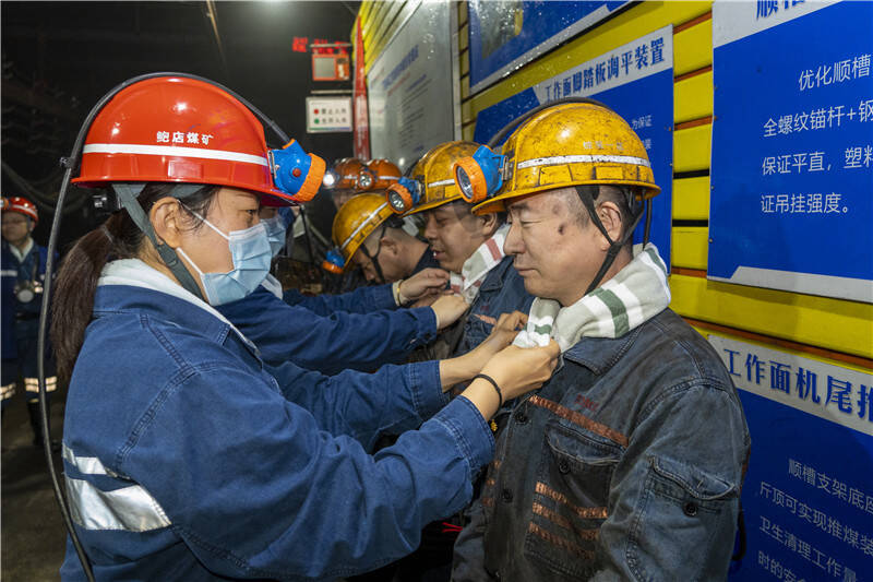 乘坐胶轮车来到7304工作面辅顺,女工家属们选择步行前往工作面,短短600米的上坡路着实让她们感触了一线职工的艰辛与艰险。到了目的地,她们主动上前,献上爱心礼物,把一双双暖心的鞋垫递到矿工的手上;一句句安全的话语,温暖在矿工的心窝上。