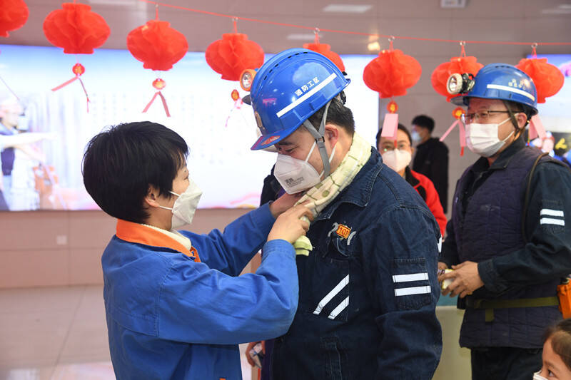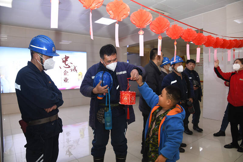 矿嫂和孩子们也来到了活动现场。孩子为父亲亲手制作了精美的花灯,妻子为丈夫擦去了脸上的汗水,一家人幸福地吃着代表“团圆”的元宵,脸上盈着笑意,眼角已闪泪光。