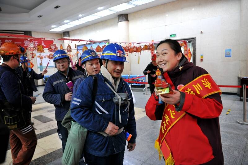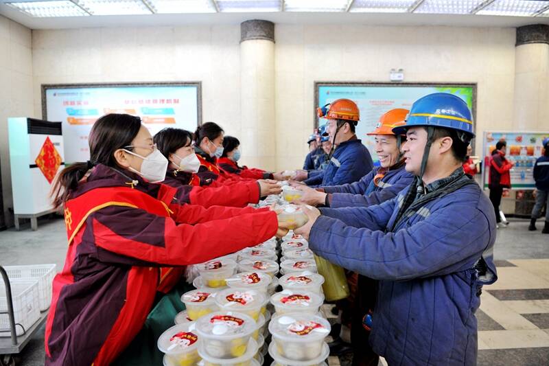 下午中班上下井时间,井口等候室人头攒动,欢声笑语不断。“师傅,您辛苦了!元宵节快乐,吃一碗甜甜的汤圆吧!工作时一定要注意安全!”“师傅们,这边猜灯谜拿奖品喽!”