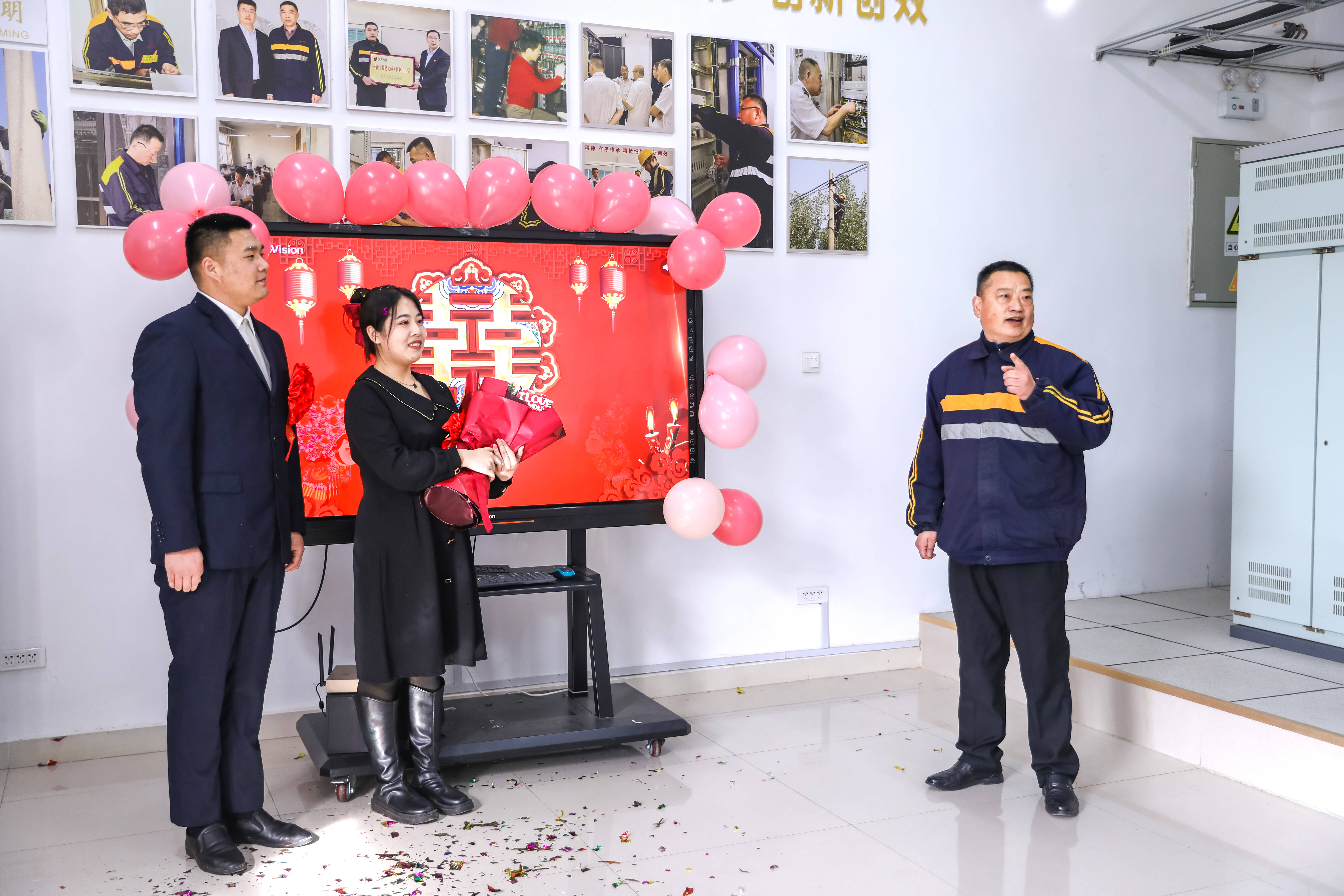 喜庆的PPT大屏、五彩的气球、娇艳的玫瑰……一个充满温馨的场地在大家齐心协力的布置下悄然呈现。