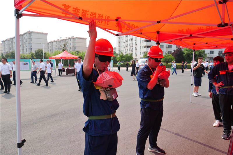 “准备好了吗?开始!”在采掘楼前互动区,随着裁判员一声令下,一场蒙眼自救器竞赛正在激烈上演。比赛过程中,参赛选手们在遮住双眼的情况下,用手感触着自救器的每个部件,认真快速按照自救器佩戴操作流程规范操作,动作娴熟地打开卡扣,取下上盖、展开气囊、将口具放在唇齿间、逆时针旋转开关钮、同时用手指按动补气板,给气囊充氧气、夹住鼻夹等一系列步骤,完成全部动作后举手示意。“15秒68!”“17秒45!”刚刚赢得比赛的生产准备工区职工明显对表现不满意,“下次要向10秒内进军。”