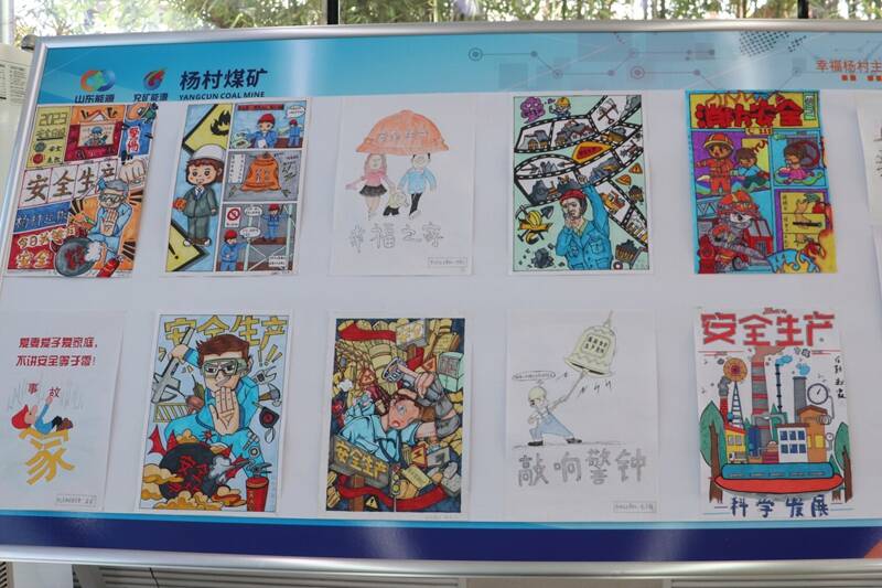 在杨村煤矿井口候罐室,由该矿组织职工亲手绘制的安全漫画近百幅,每幅作品都将安全生产理念渗入到工作和生活中,主题鲜明、生动有趣,时刻提醒着职工事故猛于虎、安全大于天。