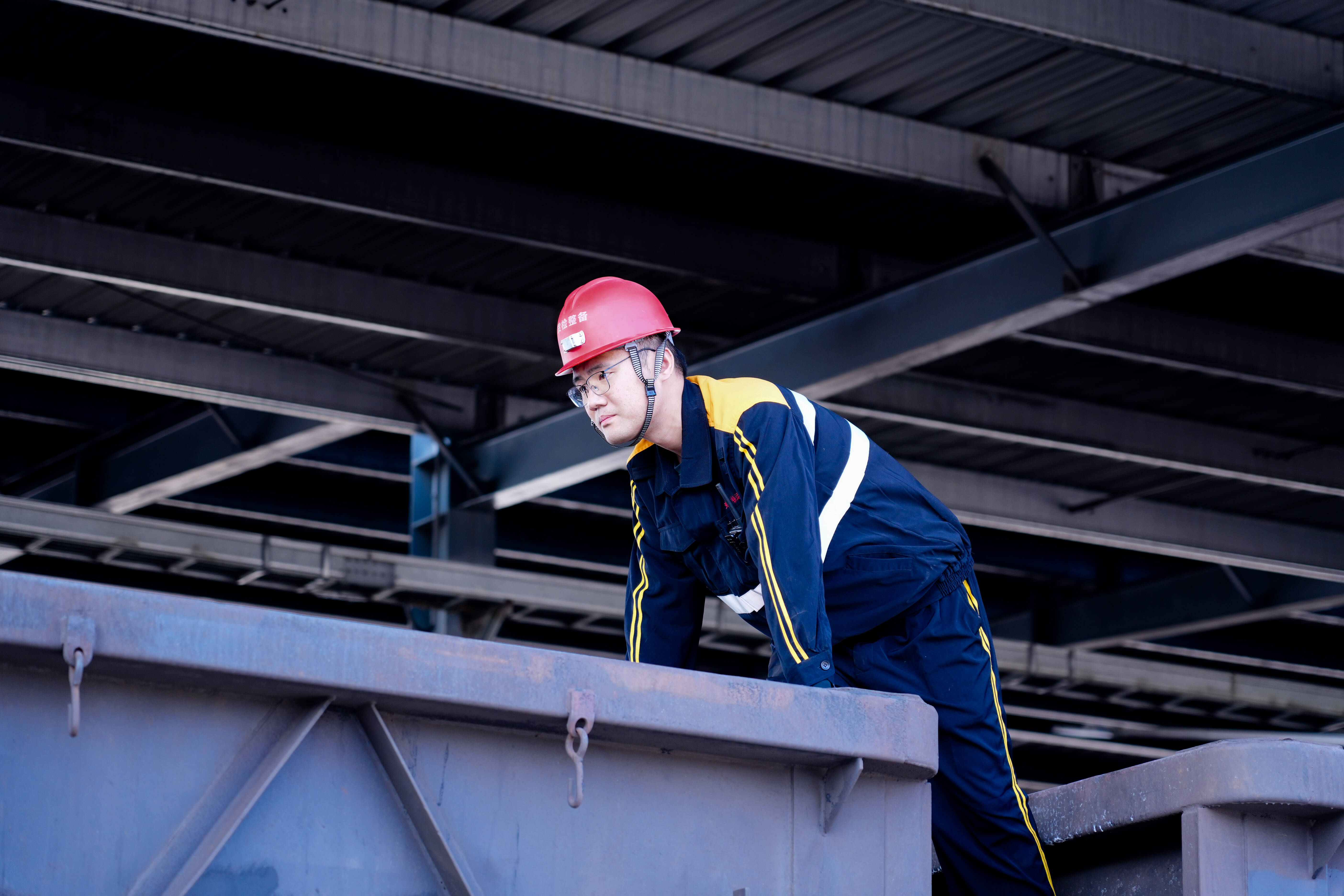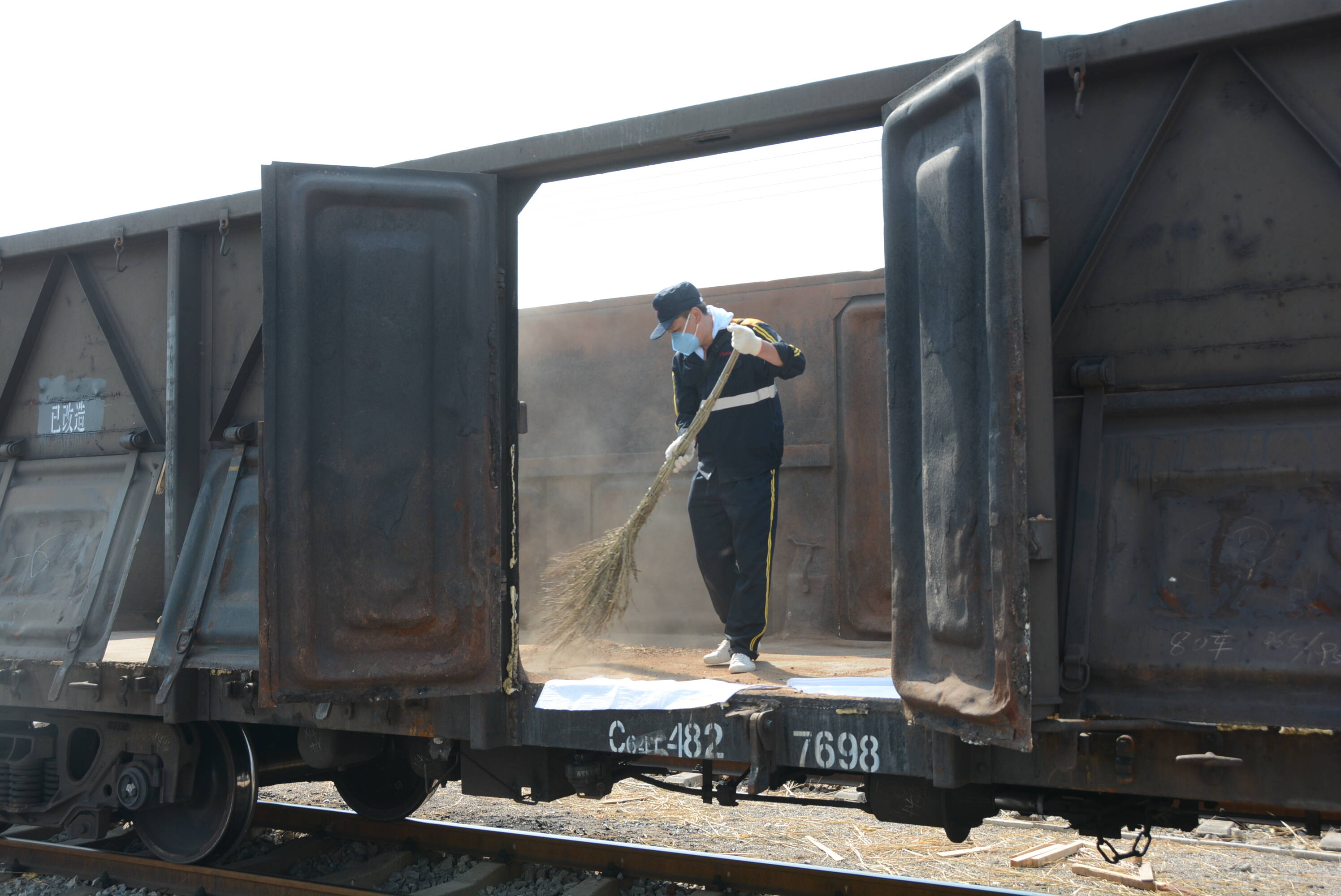 老王治疗“外伤”的同时,另一名检修员程刚,已经手脚并用地翻过车皮,爬到了车厢内诊治“内伤”,仔细清扫红土、砂石、石灰,确保煤质不被污染。在骄阳的炙烤下,车厢彷佛一个个大“烤箱”,高温、半封闭,扫帚挥舞的瞬间就进入了“蒸桑拿”模式,程刚身上的工作服湿漉漉的粘在后背上。每节车厢两侧都需攀爬1次,车厢有2米半高,一列车50到60节车厢,一列车就需要攀爬300米,高运期间一个班次干6列车,需要攀爬1800米。“一个班下来,两条腿都不是自己的了。”就连像程刚这样身强力壮的年轻人也感叹工作量的庞大。