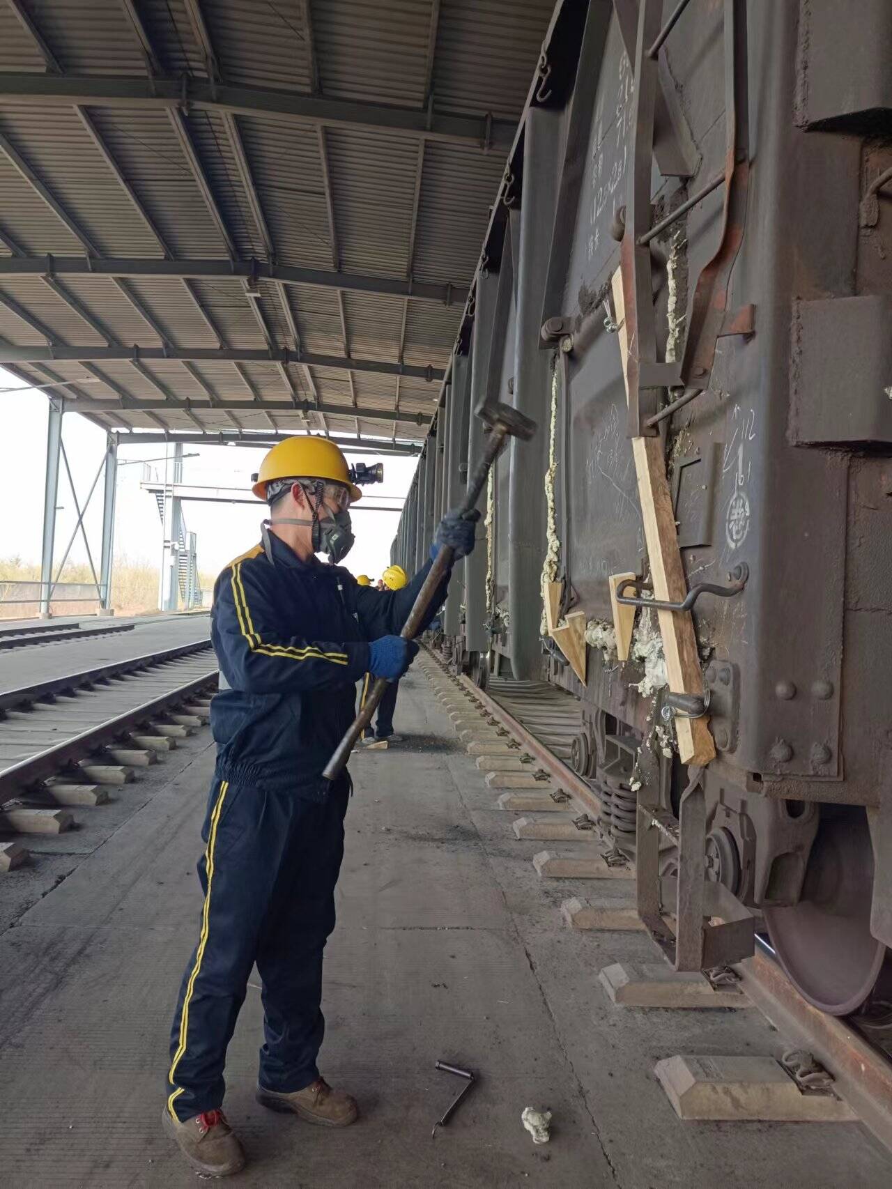 “这煤从地底下挖出来挺不容易的,不能在咱这发运的路上出岔子不是?”王建民扛着大锤边走边说,他上下打量着黑黢黢的车皮,不断寻找着“病灶”。只看老王收住脚步,双脚前后站定,膝盖微曲,肩上的大锤已紧握在手中,锤头冲后扬过头顶,画出半圆弧线后,“咚”的一声砸在了车皮的变形处,几锤后药到病除。五十多岁的王建民已经给车皮“把脉治病”了大半辈子,7斤多的大锤每天都要挥舞几百次,已经数不清为多少车厢维过修、整过形。