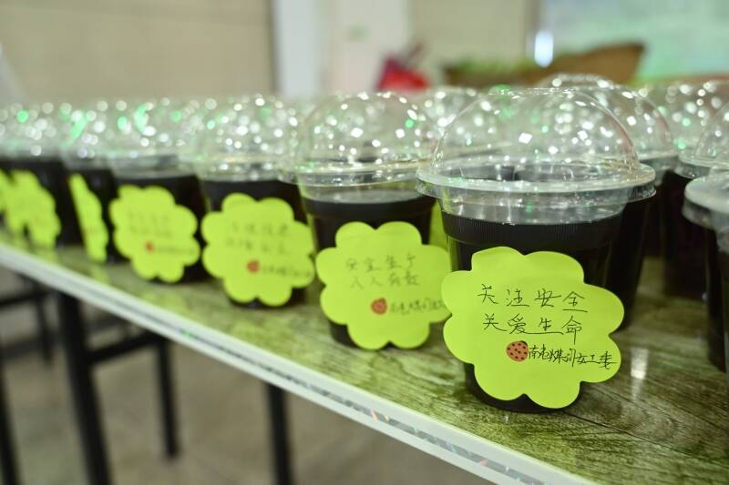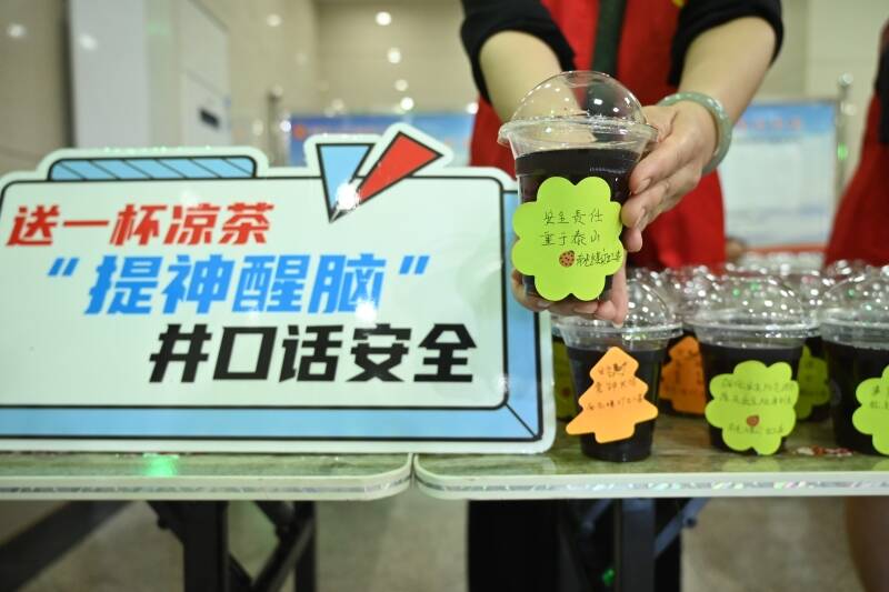 在井口,该矿女工协管员每盛满一杯凉茶,都会把手写的安全寄语贴到凉茶杯上,希望每一名职工师傅都能通过不同的安全寄语感受到安全的重要性,绷紧高温作业下的安全生产。