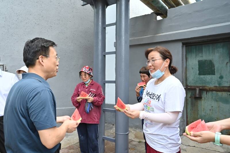 后勤服务中心组织暖心志愿者到生产一线,为在高温环境工作的职工送去西瓜、凉茶等解暑物品,叮嘱大家做好防暑降温工作,严把生产现场安全关。