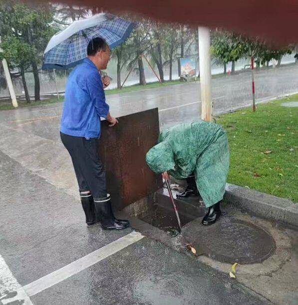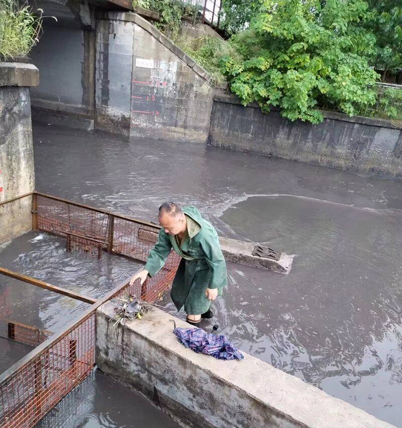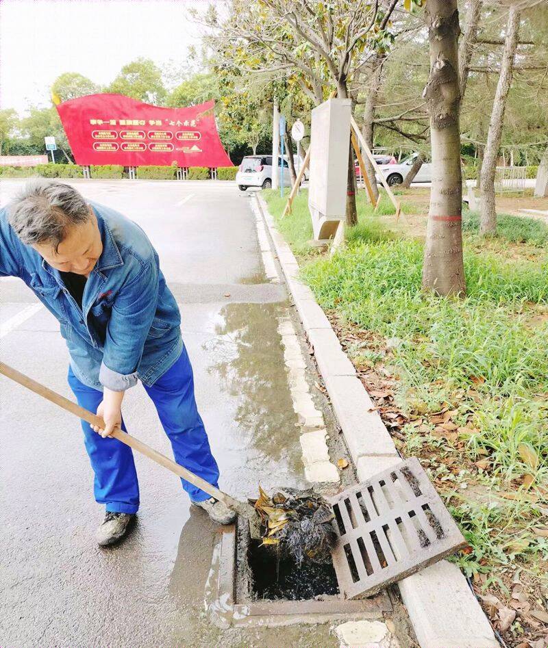 在矿井区工广主要道路,他们冒雨巡查,对低洼点、排水点,动态清理雨水箅子上的树叶杂物,“手动”助排水,及时排积水,保障矿区安全。