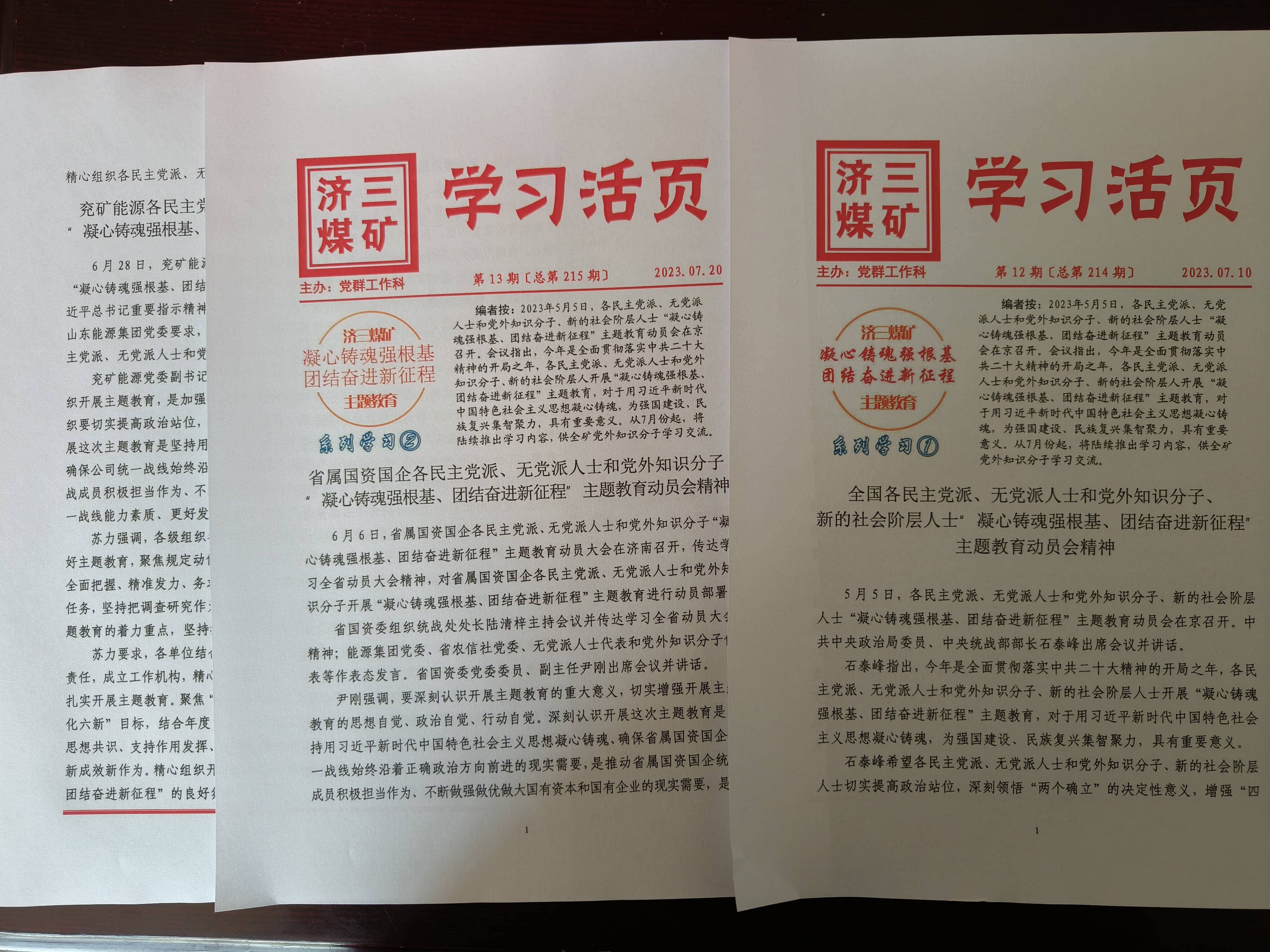 在宣传学习的深度、广度、力度上下功夫,充分发挥融媒体互动优势,在济三网站、“至美济三”公众号开专题设专栏,精心组织宣传,深化理论阐释,全方位、多角度宣传解读;编发《学习活页》《宣传活页》,及时宣传中央、省委、两级公司党委开展“凝心铸魂强根基、团结奋进新征程”主题教育工作会议精神及本矿主题教育开展情况,号召全矿党外知识分子切实提高政治站位,充分认识开展主题教育的重大意义,坚守立场、恪守忠诚、凝聚共识、立足岗位,坚定拥护“两个确立”、坚决做到“两个维护”。强化理论武装,为部分党外知识分子骨干发放《习近平新时代中国特色社会主义思想专题摘编》、党的二十大精神报告等书籍,建立党外知识分子学习交流群,形成“线上+线下”互动学习格局,营造浓厚氛围。