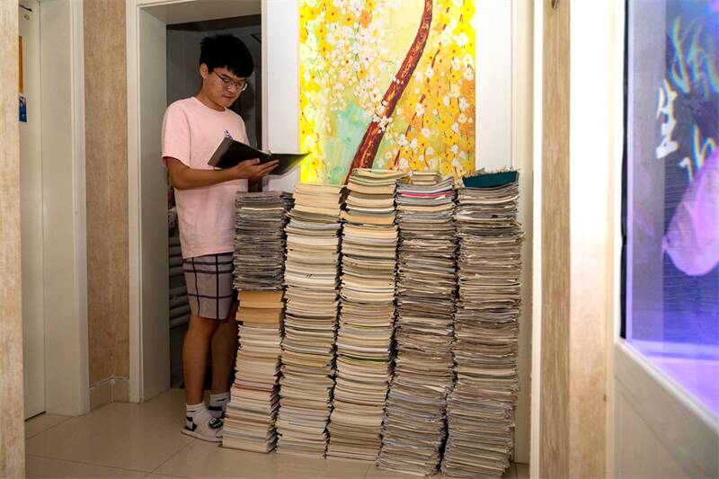 再好的学习方法,也离不开勤奋。走进周文硕家中,书房门口堆积如山的学习资料让人印象深刻。据他的父亲周振说:这仅仅是高中三年积累下来的一部分。在得知孩子被北大录取后,亲朋好友们纷纷来到家中,拿走了一部分学习笔记和资料。