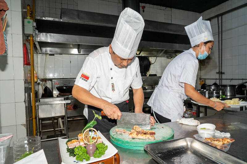 中式烹调师比赛现场,参赛选手需要在60分钟之内完成两道自选菜品。他们全身心投入到比赛中,熟练运用煎、炒、炸、蒸、煮等多种烹调技法,充分展现了刀工、火候掌控和盘艺创作技能,尽显大厨风范。