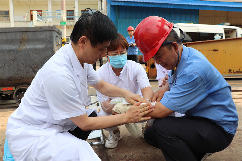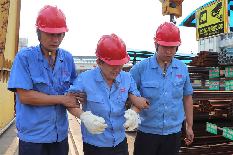 本次演练模拟机修厂门式起重机在吊运工字钢过程中,由于工字钢捆绑不当,突然发生滑落事故,一名吊装人员由于站位不当受伤,机修厂立即启动现场处置预案并逐级汇报请求救援,该矿立即启动《特种设备事故专项应急预案》应急响应,召开紧急会议安排部署各项演练任务。