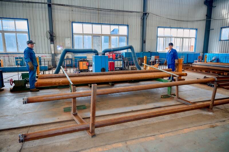 原本在完成风水管焊接后,需要职工人工将其搬运至一旁,但在当天生产现场,只见两名职工焊接完成后,站起身将风水管放置于两根斜面的支架上,通过外低内高设计,使焊钢管自动滑落至前方的U型置物架内,上下层之间通过转轴连接,减少操作过程中人员的来回搬移。