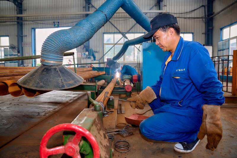 在车间的风水管路加工处,我们看到了别出心裁地焊接“自转”装置。一键启动,风水管路即可自行旋转,职工再也不用边转边焊接,达到安全高效的效果。