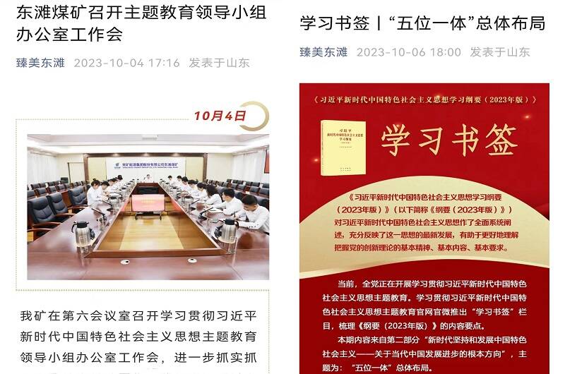 东滩煤矿党委充分发挥内宣、外宣新闻媒体平台作用,整合资源、统筹发力,强化宣传引导,创新形式,编发东滩煤矿学习贯彻习近平新时代中国特色社会主义思想主题教育简报,利用“学习强国”“灯塔—党建在线”等公共学习资源,聚焦党中央、上级公司等主流媒体关于主题教育的实时报道、评论文章、专题消息等热点内容,及时转发推送学习,做到宣传有声有色有亮点,扩大党员干部职工对主题教育的知晓率和参与度,推动主题教育入脑入心。