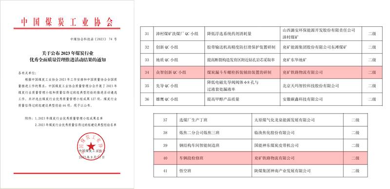近日,中国煤炭工业协会发布《关于公布2023年煤炭行业优秀全面质量管理推进活动结果的通知》,物流公司众智创新QC小组研制的课题《煤炭漏斗车螺栓拆装辅助装置的研制》,荣获2023年煤炭行业质量管理二级成果,物流公司车辆段检修班质量信得过班组《匠心筑梦 创新赋能》课题,荣获2023年质量信得过班组建设典型经验二级成果。