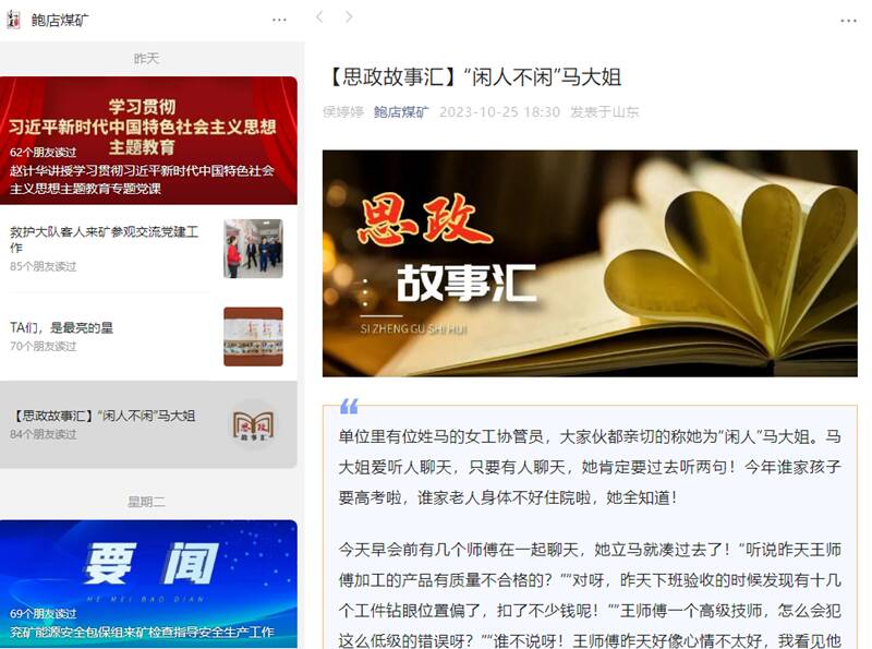 近日,鲍店煤矿订阅号“思政故事汇”里一篇篇简短引人深思的小故事引发了矿区众多职工的点赞,这是该矿一步加强和改进矿井思想政治工作的又一创新举措。